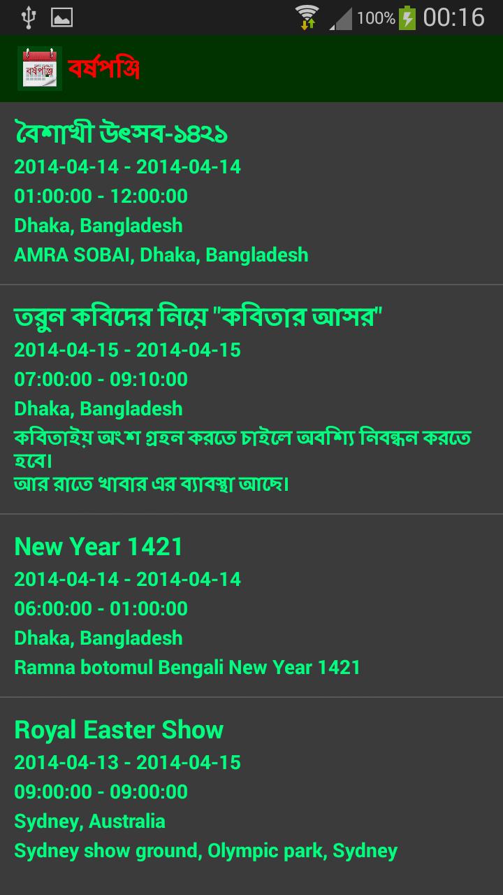 Borshoponjee es un widget de calendario bengalí completo, que proporciona fechas según "Calendario de Bangla". El usuario podrá ver diferentes eventos programados en las fechas. Permitirá al usuario agregar ubicaciones, es decir. Dhaka, Bangladesh o Londres UK y los eventos de esas ubicaciones (si las hay) se enumerarán.
