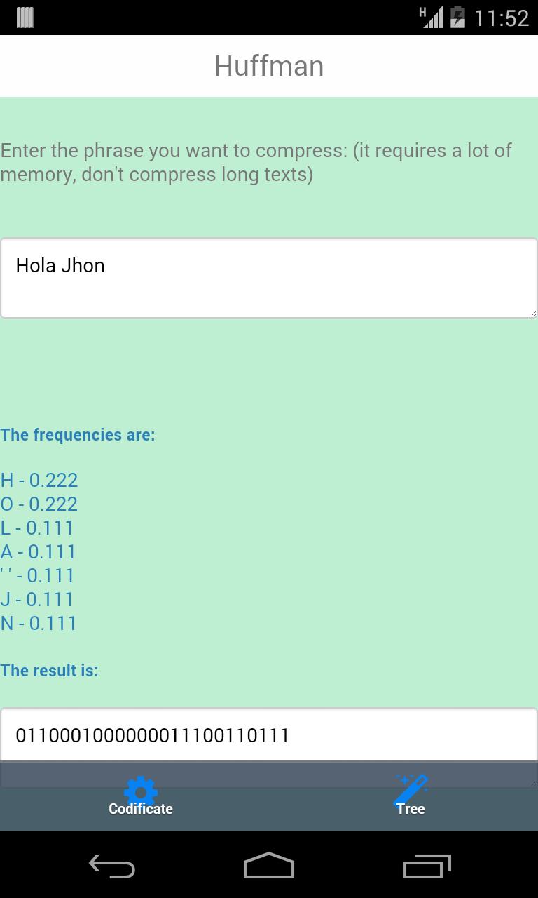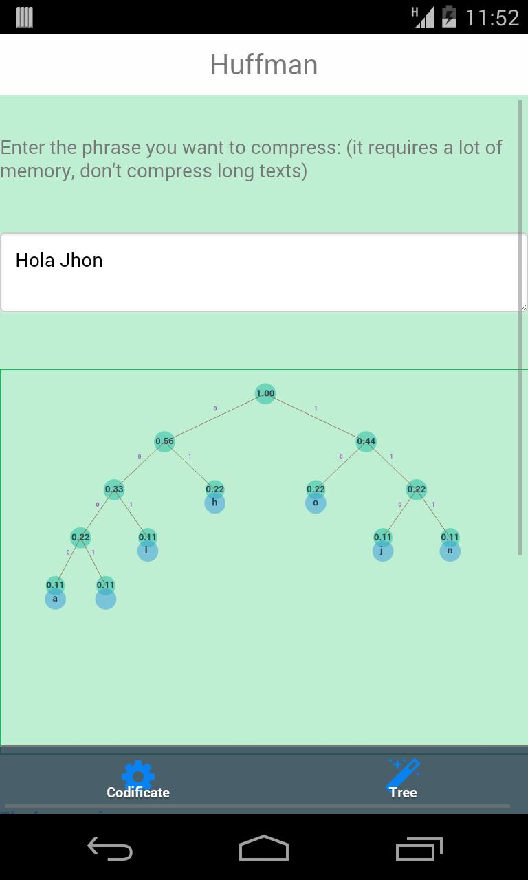 Con esta aplicación, puede comprimir todos los textos que desee. Es realmente rápido y fácil, simplemente coloque su texto y haga clic en un botón. Además, la aplicación hace el árbol Huffman por ti, es genial y fácil.
