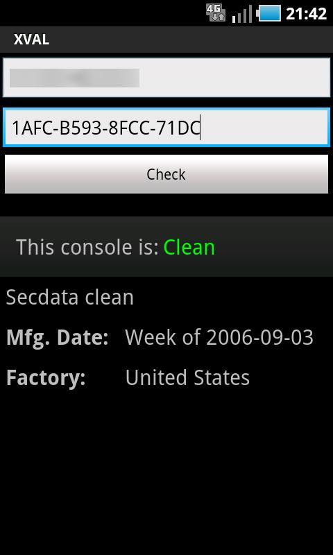 XVAL es una utilidad para mostrar eventos de seguridad grabados desde una consola Xbox 360. Cuando se le da un número de serie de la consola junto con el valor 'X' de la información del sistema en el tablero, XVAL puede determinar si esa consola está marcada o no para una violación. Esta es una implementación de Android del XVAL de Redline99, adecuado para verificar los 360 usados en las tiendas o para monitorear el historial de eventos de seguridad de su propia consola.