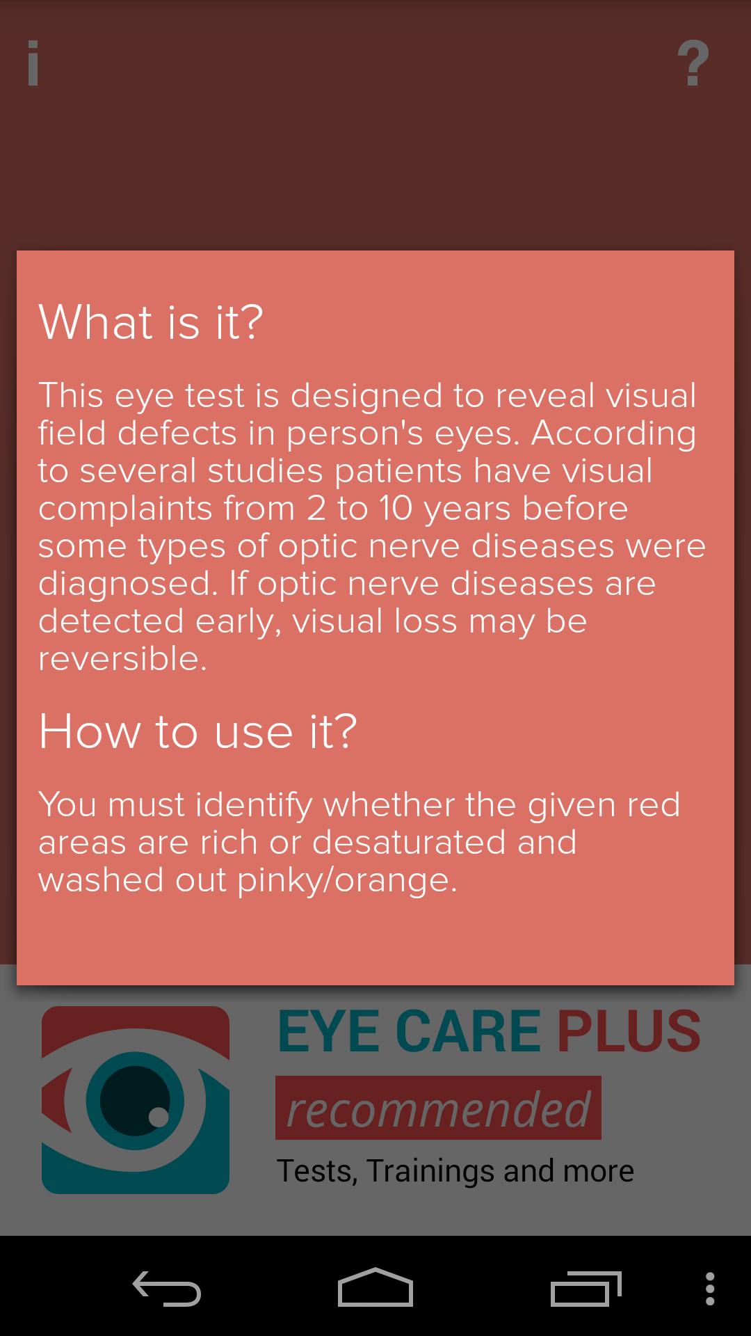 En la prueba, uno debe identificar si las áreas rojas dadas tienen el mismo color rojo rico o los colores aparecen más de color rosa o naranja desaturado. Al final de la prueba, los resultados mostrarán si la persona puede tener defectos de campo visual neurológico o no para cada ojo por separado.