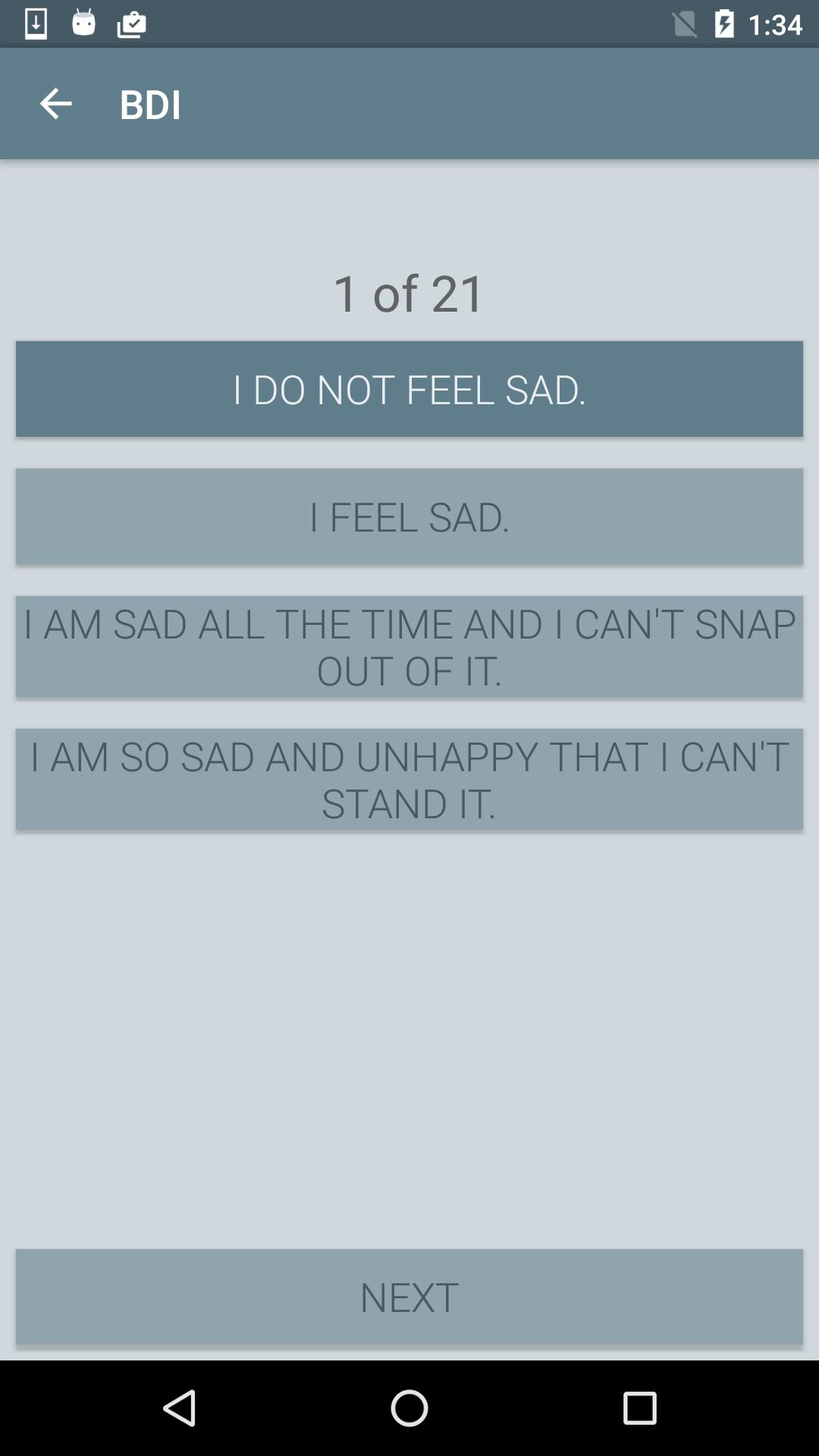 Esta aplicación le permite tomar pruebas psicológicas. El primero es el Inventario de depresión de Beck (BDI, BDI-II), creado por el Dr. Aaron T. Beck, es un inventario de autoinforme de opción múltiple de 21 preguntas, uno de los instrumentos más utilizados para medir la gravedad de la depresión.