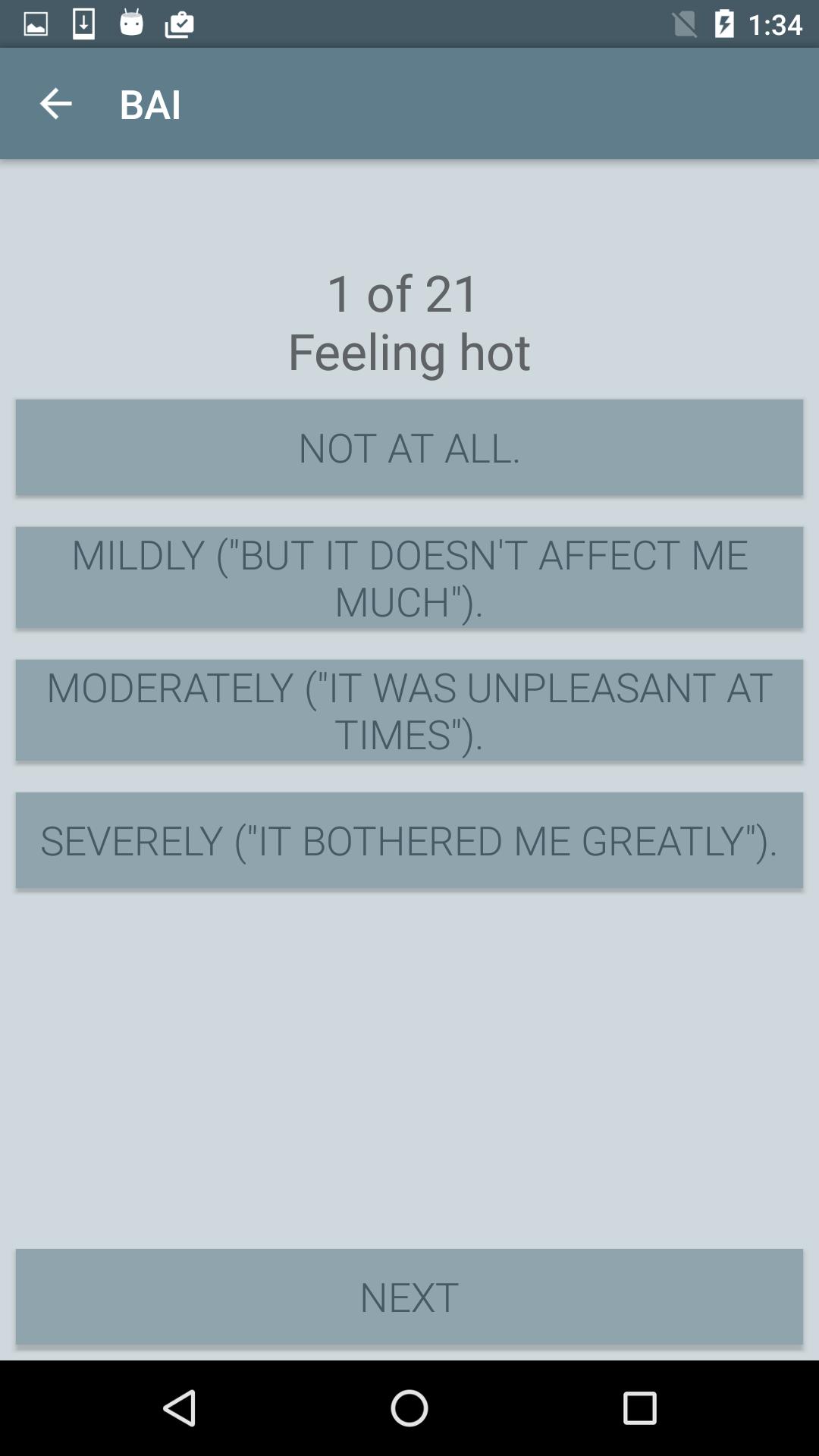 El Secong es el Inventario de Ansiedad de Beck (BAI), creado por el Dr. Aaron T. Beck y otros colegas, es un inventario de autoinforme de opción múltiple de 21 preguntas que se utiliza para medir la gravedad de la ansiedad de un individuo.
