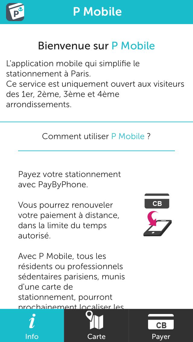 P Mobile es la aplicación de la ciudad de París, que facilita los costos de estacionamiento de los visitantes de pago en los primeros 4 distritos de París.