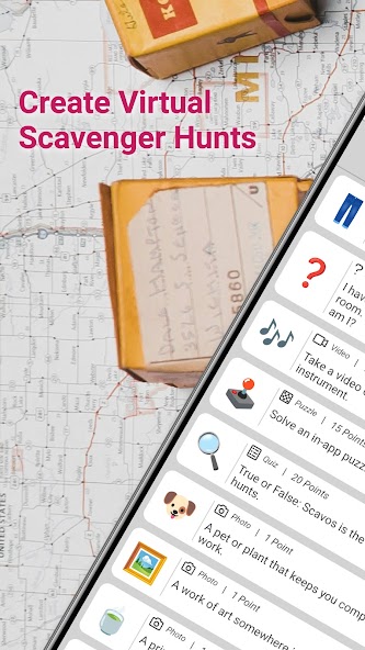 ¡Transforma cualquier ocasión en una aventura inolvidable con Scavos ! Ya sea para cumpleaños, eventos o simplemente diversión casual, Scavos ofrece atractivas cacerías del tesoro que puede crear o unirse con amigos. Repleto de rompecabezas, desafíos fotográficos y tablas de clasificación en tiempo real, se trata de divertirse juntos.