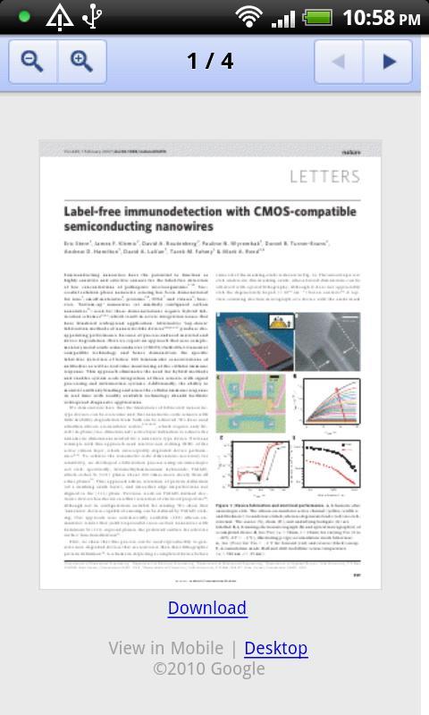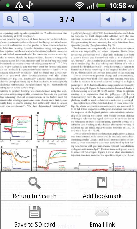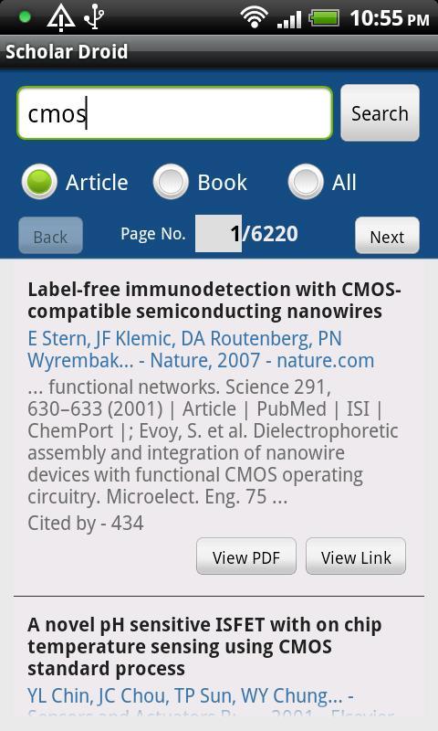 Scholar Droid es una aplicación gratuita que le permite navegar convenientemente a través de los resultados de búsqueda devueltos por Google Scholar, buscar los resultados del libro en Amazon, agregar/exportar/importar marcadores, ver/guardar artículos PDF gratuitos a la tarjeta SD y enviar enlaces de resultados de búsqueda como correo electrónico.