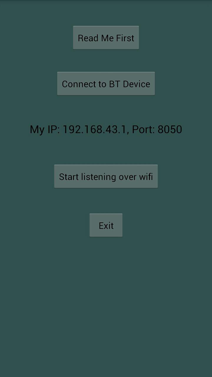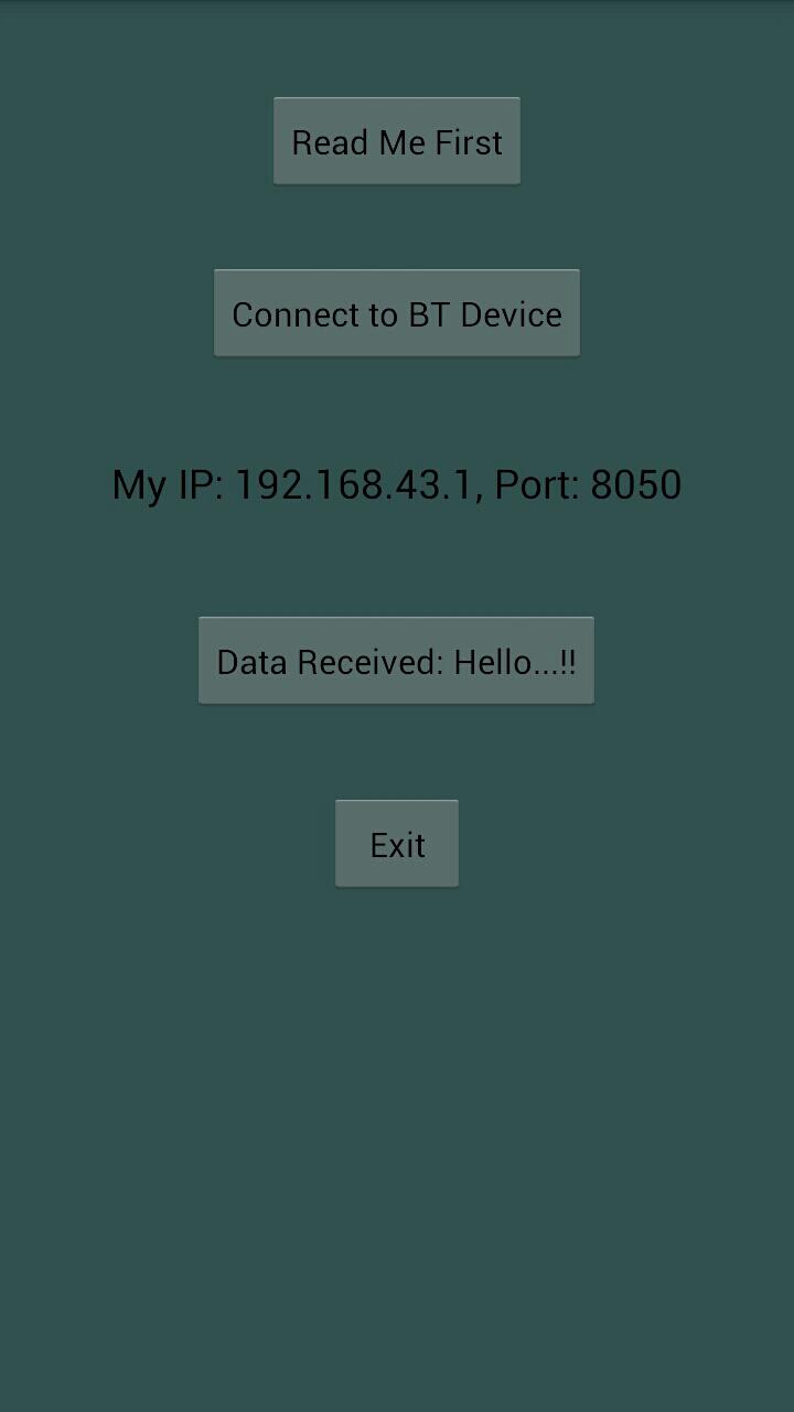 La aplicación es básicamente un terminal entre una PC/laptop y un dispositivo Bluetooth (diseñado específicamente para Arduino). Los datos se transmiten a través de un puerto TCP a través de la red WiFi y la aplicación lo vuelve a transmitir a un puerto RFCOMM. Se ha utilizado y probado en nuestro proyecto donde utilizamos un código MATLAB o Java para hacer una conexión del lado del cliente y transferir datos a un Arduino que controla un robot. Los detalles se pueden encontrar en mi sitio web. ¡¡Salud!!