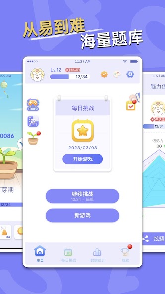 ✓ Poder cerebral. Estadísticas y análisis multidimensionales del rendimiento del cerebro al tiempo que resuelven rompecabezas.