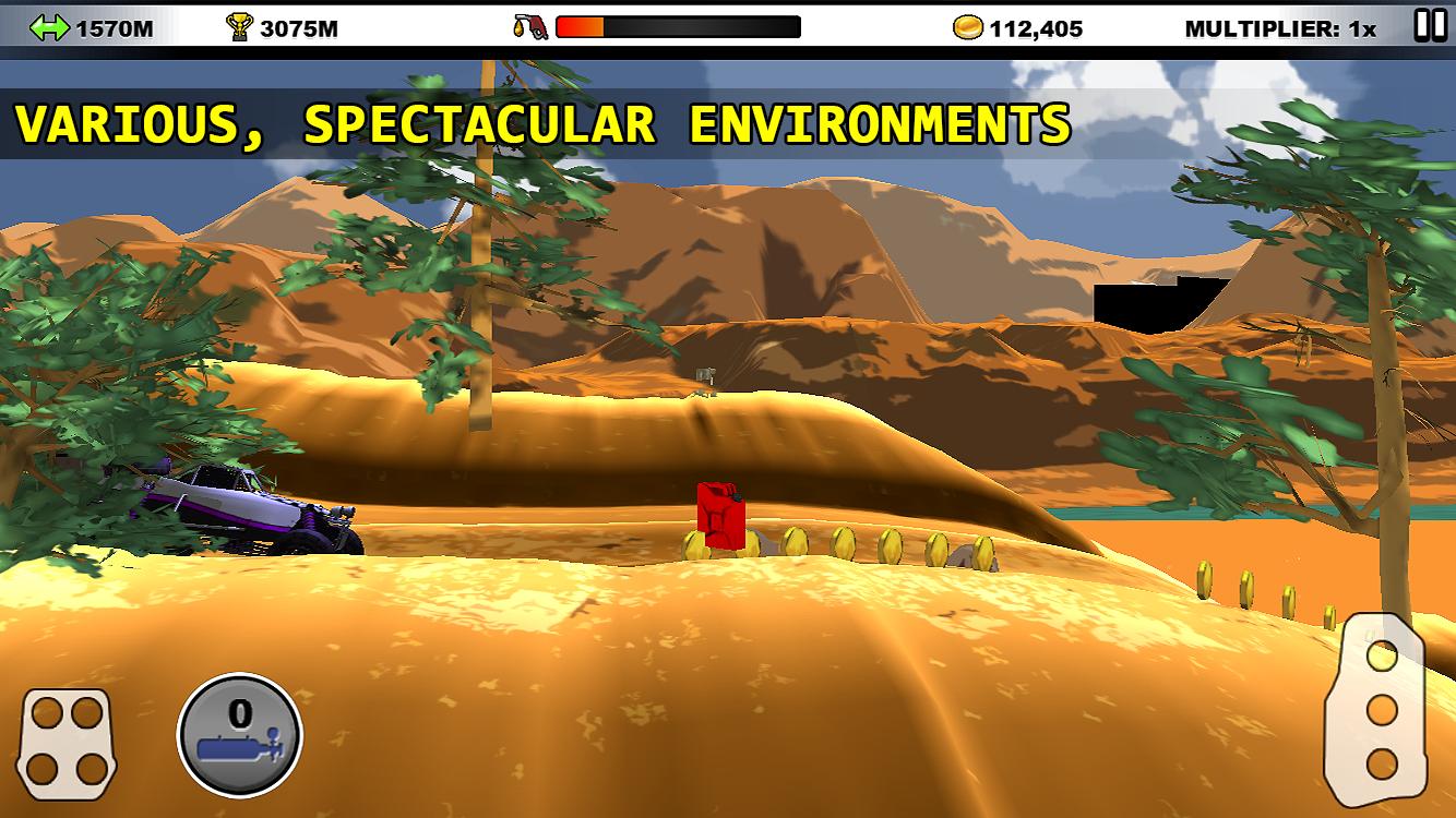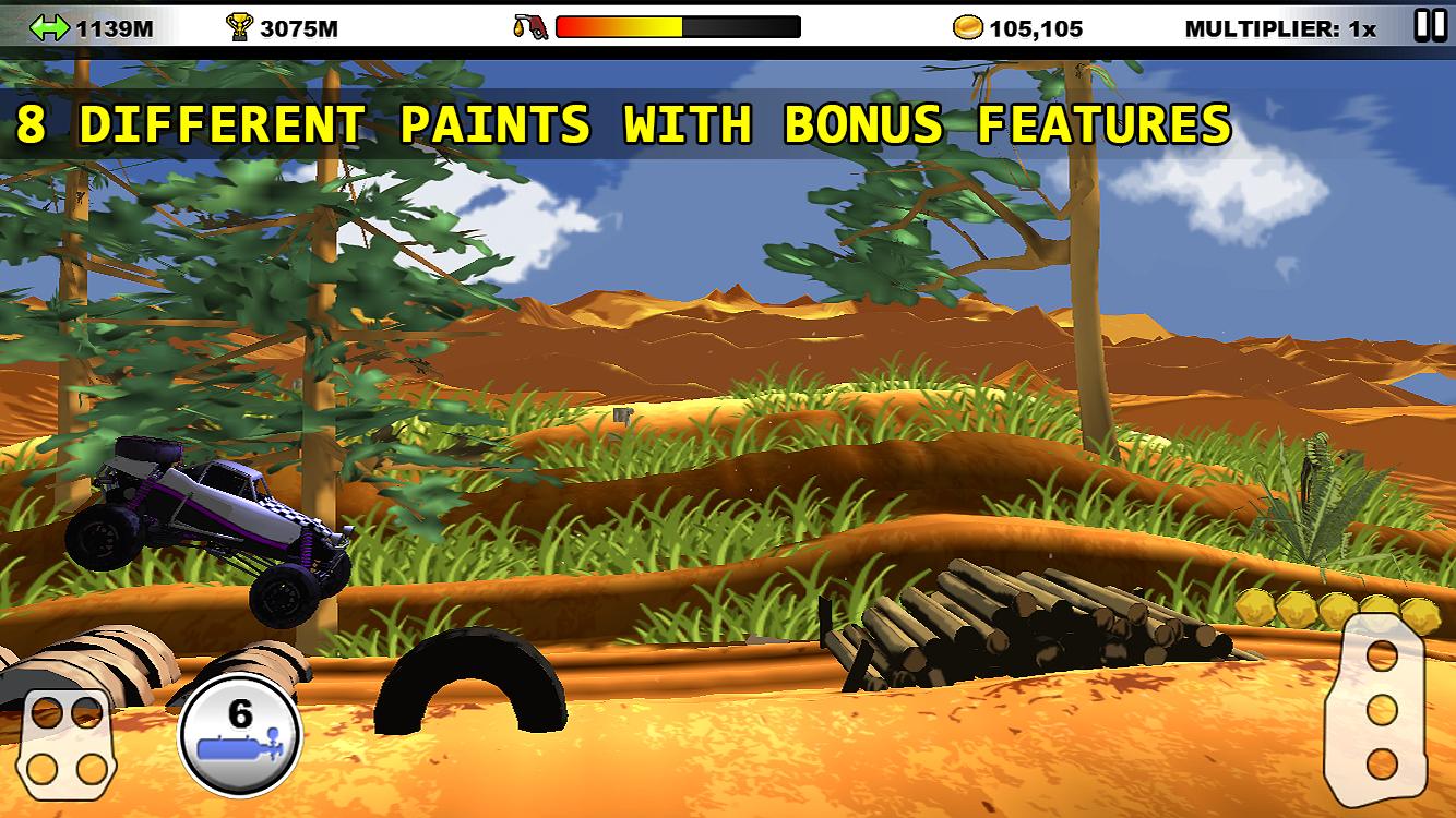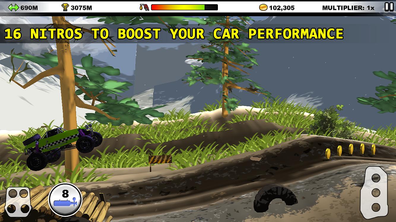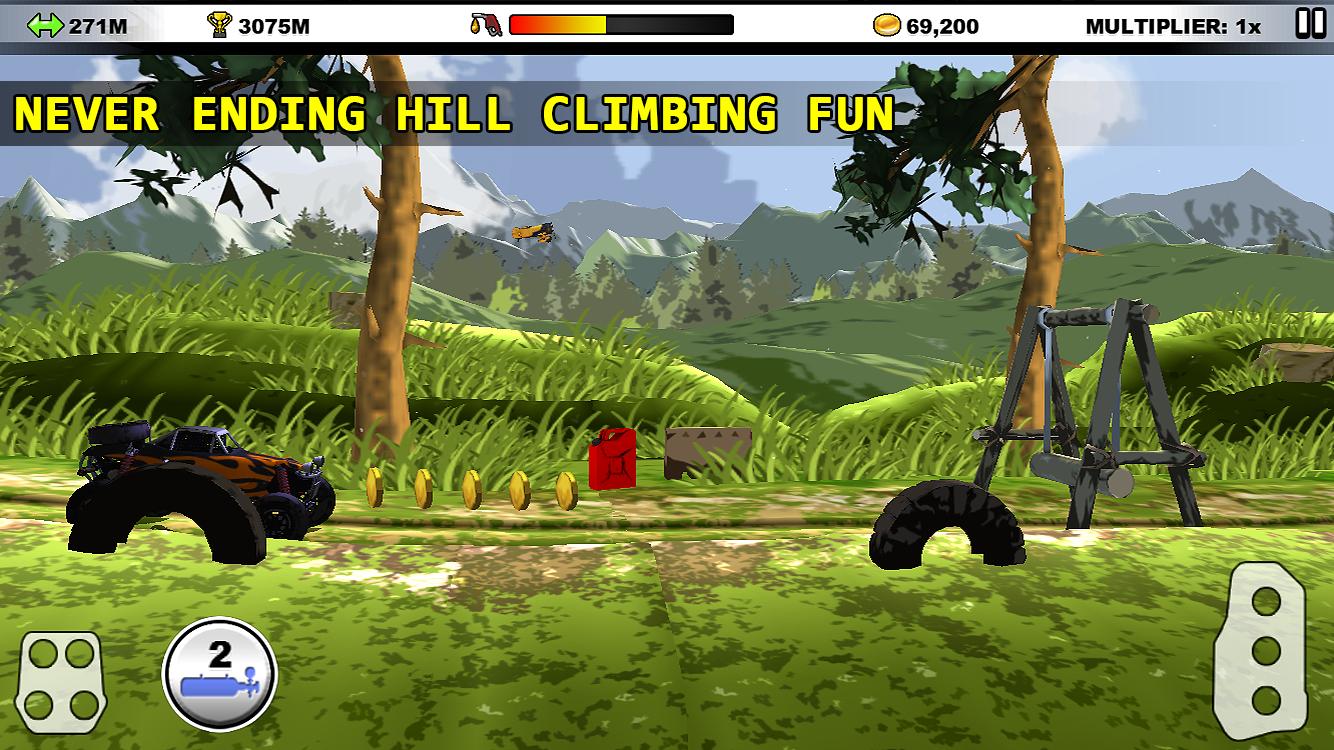 Enfrentemos los desafíos de la acción interminable de ascenso de la colina. Recoja monedas y ajuste su automóvil. Cuanto más distancia tome, más monedas se pueden recolectar. Pase estas monedas para comprar actualizaciones para su automóvil, para que pueda alcanzar una distancia más alta. No olvides cambiar la pintura de tu auto. Las diferentes pinturas dan varios impulso a su automóvil. Siéntase libre de cambiar entre ellos la raza por raza. Verifique repetidamente el indicador de combustible mientras corre porque fuera del combustible provoca el final del juego.