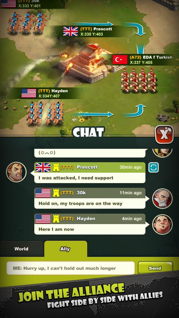 Empire: War of Rome tiene un sistema de alianza único con traducción en tiempo real de 43 idiomas. Los miembros de la alianza pueden ayudarse mutuamente, colaborar en tareas, actuar en equipos y reforzar el poder de los amigos. Interacción total, guerra total.