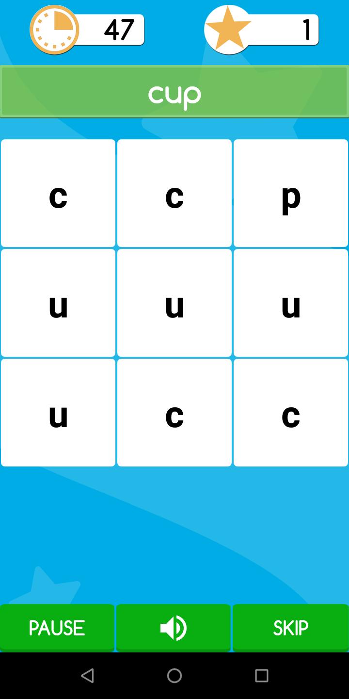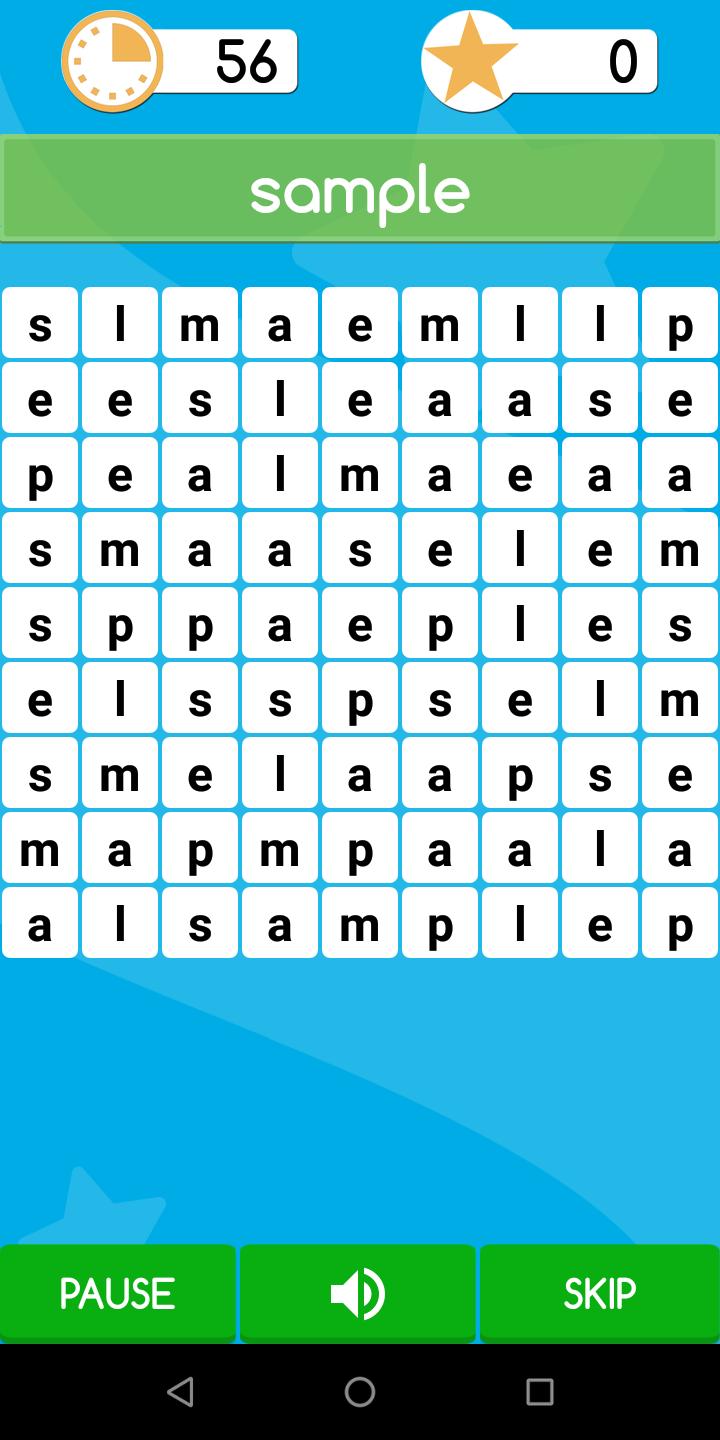 Un juego en el que el usuario hace todo lo posible para encontrar tantas palabras como pueda en un minuto. Una palabra aparece solo una vez en la cuadrícula. Hay tres niveles fáciles, medianos y duros según la necesidad del usuario.