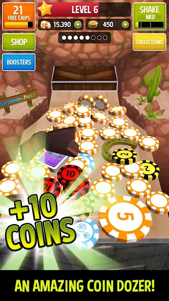 ¿Alguna vez jugaste este juego de arcade favorito en un carnaval, feria estatal o casino? Esta emocionante aplicación Coin Dozer está llena de grandes premios de chips y especiales de monedas. Deja caer las fichas en el lugar correcto y gane más chips y premios como mazos para tarjetas, dados y toneladas.
