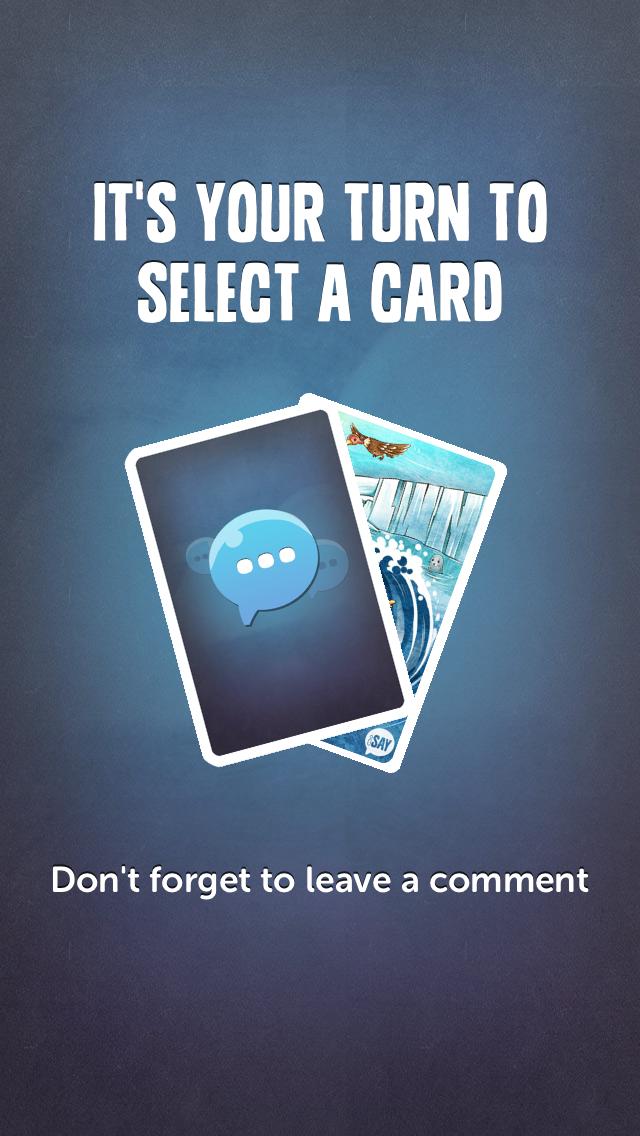 Tómelo a su vez para decir algo, inspirándose en una de sus cartas. Lo que dices podría ser original o podría incorporar letras de canciones, títulos de películas y frases comunes. Otros jugadores seleccionarán una carta que sienten los mejores partidos de lo que has dicho y estas cartas, junto con las tuyas, serán barajadas y reveladas. ¿Todos sabrán la identidad de la tarjeta original o sus amigos podrán engañarse mutuamente?