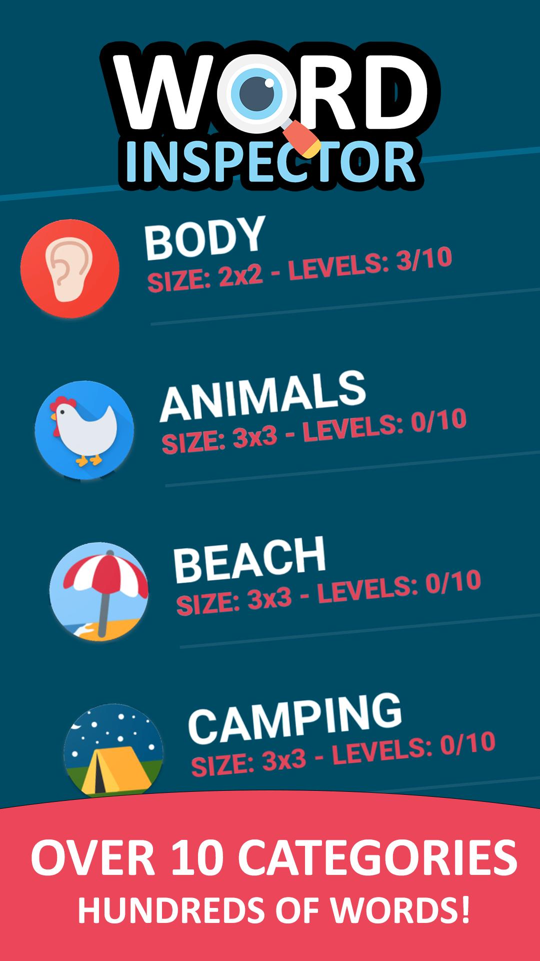 Conviértete en un verdadero inspector y encuentra las palabras ocultas en este juego, eres el inspector y depende de ti encontrar todas las palabras, hay diferentes categorías y todas son solucionables y muy divertidas de jugar. La dificultad en cada categoría aumenta a medida que juegas. ¡También puedes aprender y expandir tu vocabulario tocando!