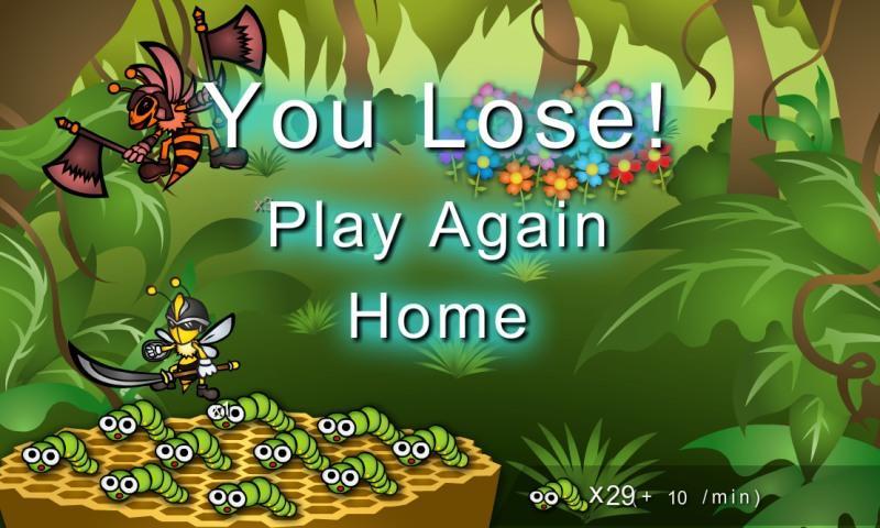 Su majestuoso imperio ha disfrutado durante mucho tiempo su paz y prosperidad, con ricos recursos y colonias bien construidas que se extienden por todo el reino. Pero tu ambicioso vecino, el Reino de los Hornets, está lanzando los ojos codiciosos en tu tierra natal. Se envían hordas de soldaduras feroces para invadir su imperio con solo un objetivo: apoderarse y colonizar la tierra. Debe salvar el día cultivando su ejército y expulsar a los intrusos maliciosos. Cuando comience el juego, las larvas crecerán lentamente una por una en la esquina inferior izquierda. Por encima de las larvas, puede encontrar un panel de selección, que contiene 3 tipos de abejas para que se reproduzca. El que está en la cima es el soldado que se defiende contra los enemigos; El que está en el medio es la abeja trabajadora, que puede aumentar la cantidad entrante de recursos (cariño, por supuesto); y el que está en la parte inferior del panel es el dron, que genera y aumenta la tasa de natalidad de las larvas. Cada tipo de abejas requiere una cantidad específica de recursos para crecer, y esto se muestra a la derecha del panel de selección. Para hacer crecer un tipo de abeja, simplemente haga clic en el icono correspondiente en el panel. La tasa de recursos entrante actual se muestra en la parte superior de la pantalla, mientras que la tasa de natalidad de las larvas se muestra en la parte inferior derecha. Cuando se acerca una ola de avisolos, aparecerá un temporizador a la derecha de la pantalla, lo que indica los segundos restantes para su preparación. Cuando lleguen los enemigos, comenzarán a atacar a los miembros de tu imperio. Los miembros serán eliminados cuando estén bajo ataques violentos, pero puedes hacer crecer continuamente nuevos miembros durante la batalla por una mejor defensa. Si todos sus soldados son derrotados, los Hornets llegarán a la colmena en la esquina superior izquierda e intentarán destruirlo, y si la colmena está completamente rota, pierdes el juego. Si se elimina una ola de intrusos, los Hornets dejarán de fuego temporalmente, pero pronto volverán con una legión más grande y más fuerte. Después de 9 rondas de olas violentas, la reina Hornet se unirá a la batalla final directamente, y debes derrotarla para declarar la victoria. ¡Elimina los demonios y devuelve la paz a tu amado imperio!