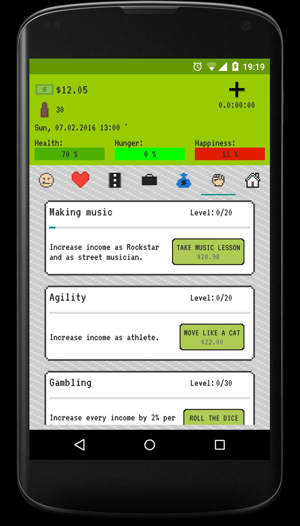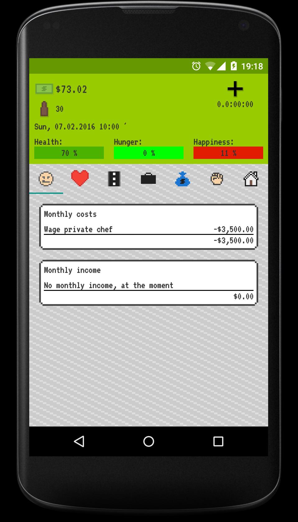 En la primera parte, su objetivo principal es sobrevivir y este no es fácil. Tienes tres valores de estado diferentes: salud, felicidad y hambre. ¿Su salud va al 0% o menos, morirá y su juego real ha terminado? ¿Tu felicidad alcanza el 0%, dañarás permanentemente tu salud? Además, cuando el hambre alcanza el 100%, dañará permanentemente su salud. Por lo tanto, debe mantener los tres valores en la zona verde.