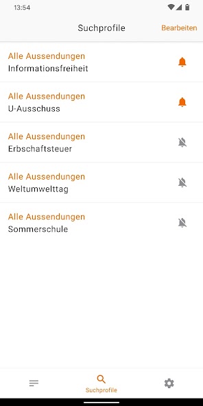 Vous avez la possibilité de recevoir des notifications ("Push Notifications") pour chaque profil de recherche. Sous l'élément de menu "Profils de recherche", vous pouvez activer et désactiver le symbole de cloche respectif. Les profils de recherche peuvent également être supprimés à l'aide du bouton "Modifier".