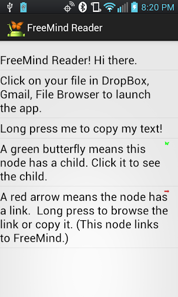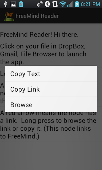 Gratuit, pas d'annonces. Emmenez vos cartes d'esprit Freemind avec vous! Cette application affiche des fichiers FreeMind ".mm" à partir de votre navigateur de fichiers, Gmail, Email, Dropbox, Google Drive, etc ... Appuyez sur un nœud pour copier le texte et, pour les nœuds qui ont des liens, vous pouvez copier le lien ou le parcourir directement sur votre appareil.