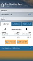 Cette application permet aux voyageurs de rechercher les taux de Per Diem du gouvernement fédéral par la ville / l'État et le code postal dans des endroits des États-Unis et de ses territoires. Per Diem est l'allocation quotidienne pour l'hébergement (à l'exclusion des taxes), les repas et les dépenses accessoires. Ces tarifs sont établis par la General Services Administration pour des destinations dans les 48 États-Unis contigus inférieurs et par le ministère américain de la Défense pour les emplacements en Alaska, à Hawaï et aux territoires américains. Le Département d'État américain établit des tarifs pour les emplacements de voyage étrangers.