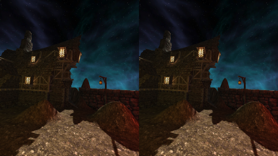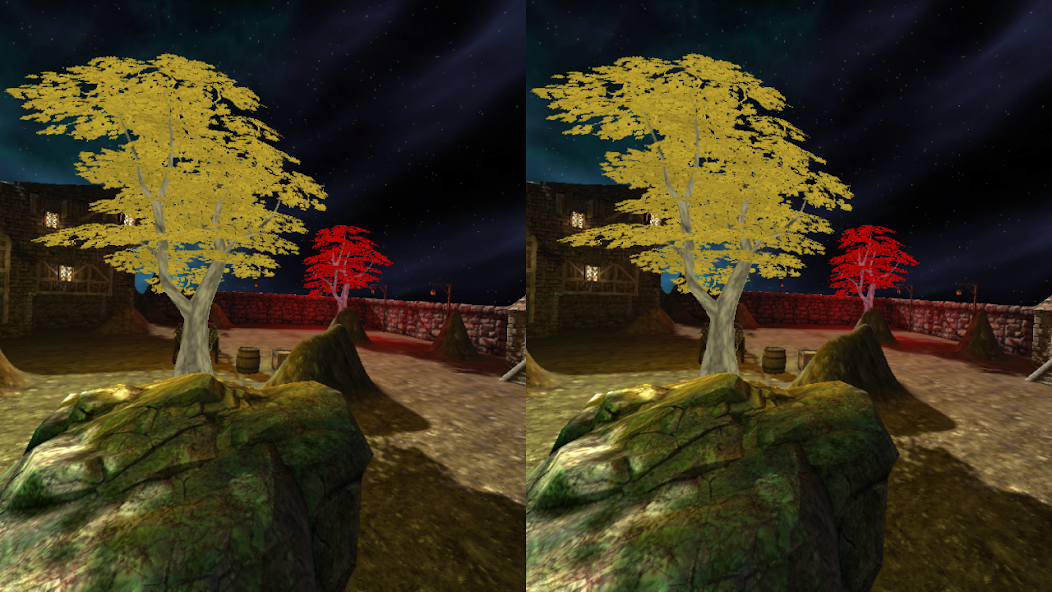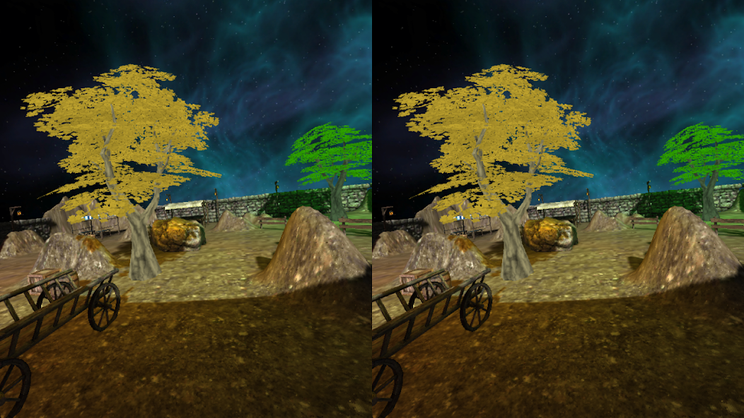 Un environnement 3D agréable via en carton VR. Cet environnement contient des arbres, des maisons, des stands, des chariots, des rochers, etc. Déplacez votre tête à 360 degrés et profitez-en!