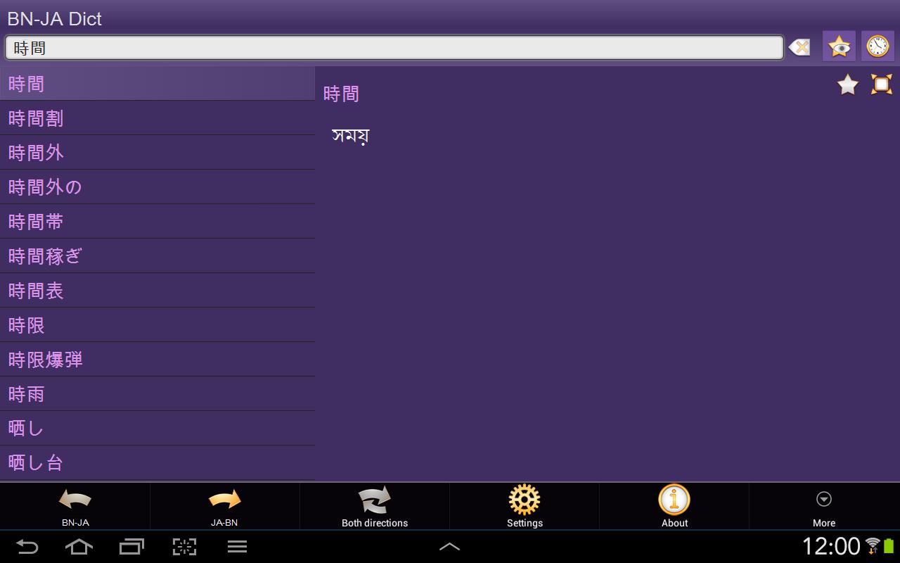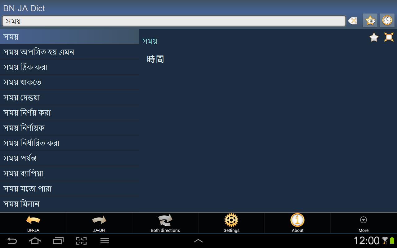Il s'agit du dictionnaire bengali - japonais et japonais - bengali; বাংলা - জাপানি এবং জাপানি - বাংলা অভিধান / ベンガル語 - 日本語、日本語 - ベンガル語辞書. L'application fonctionne hors ligne et n'a pas besoin de la connexion Internet.