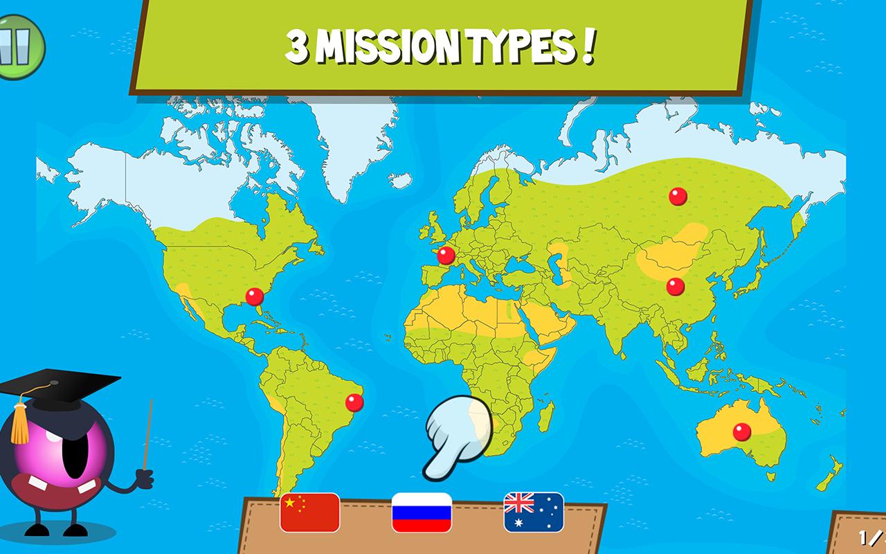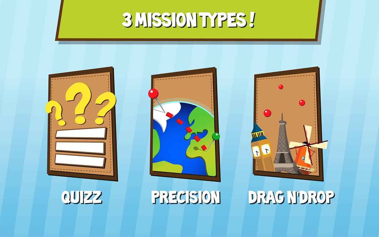 À travers 3 modes de jeu et 36 niveaux, découvrez où se trouvent les 182 pays, capitales et monuments du monde; Identifier et mémoriser les drapeaux de tous les pays!