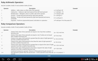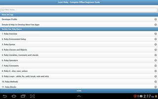 L' Learn Ruby Offline vous guide le long du chemin de l'illumination afin d'apprendre Ruby. L'objectif est d'apprendre le langage Ruby, la syntaxe, la structure et certaines fonctions et bibliothèques communes. Nous vous enseignons également la culture. Le test n'est pas seulement quelque chose auquel nous payons le service des lèvres, mais quelque chose que nous vivons. Il est essentiel dans votre quête d'apprendre et de faire de grandes choses dans la langue.