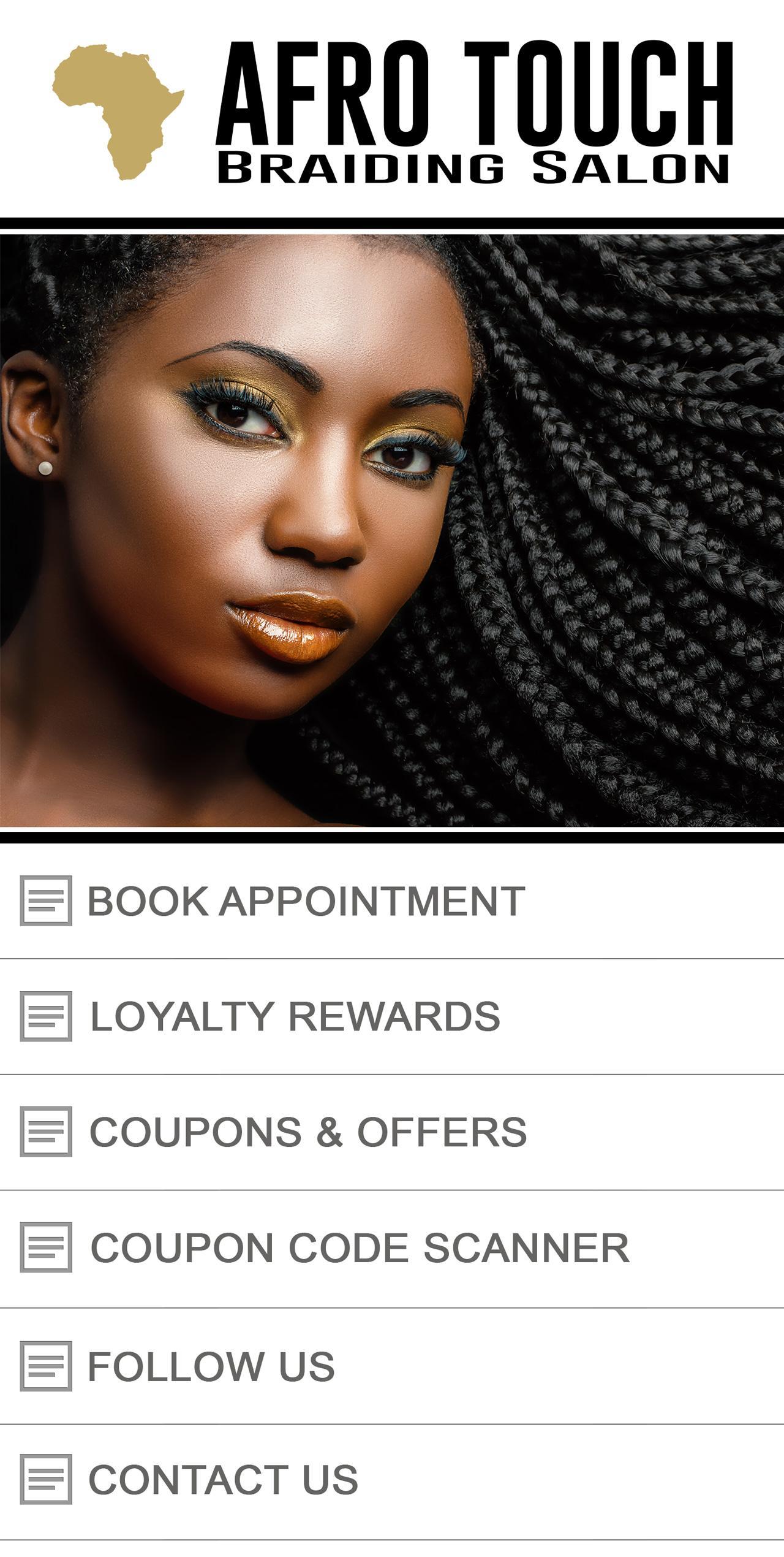 Chez Afro Touch , nous sommes fiers de beaux tresses et de coiffures naturelles pour les femmes et les hommes. Nos clients pourront réserver leurs rendez-vous pour les cheveux en utilisant notre application ainsi que pour avoir accès à nos offres et promotions spéciales. Les visiteurs fréquents peuvent utiliser notre programme de fidélité pour des remises supplémentaires pour les services fournis. Téléchargez notre application aujourd'hui et laissez-nous créer votre style Afro Touch Signature.