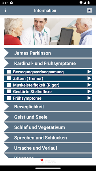 L'application vous offre des informations multimédias sur les causes et les antécédents de la maladie de Parkinson. En résumé, vous pouvez choisir parmi d'autres domaines: