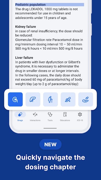 Parallèlement à une base de données complète de médicaments, l'application comprend un certain nombre d'outils cliniques interactifs et de calculatrices de dosage utiles dans votre pratique quotidienne.