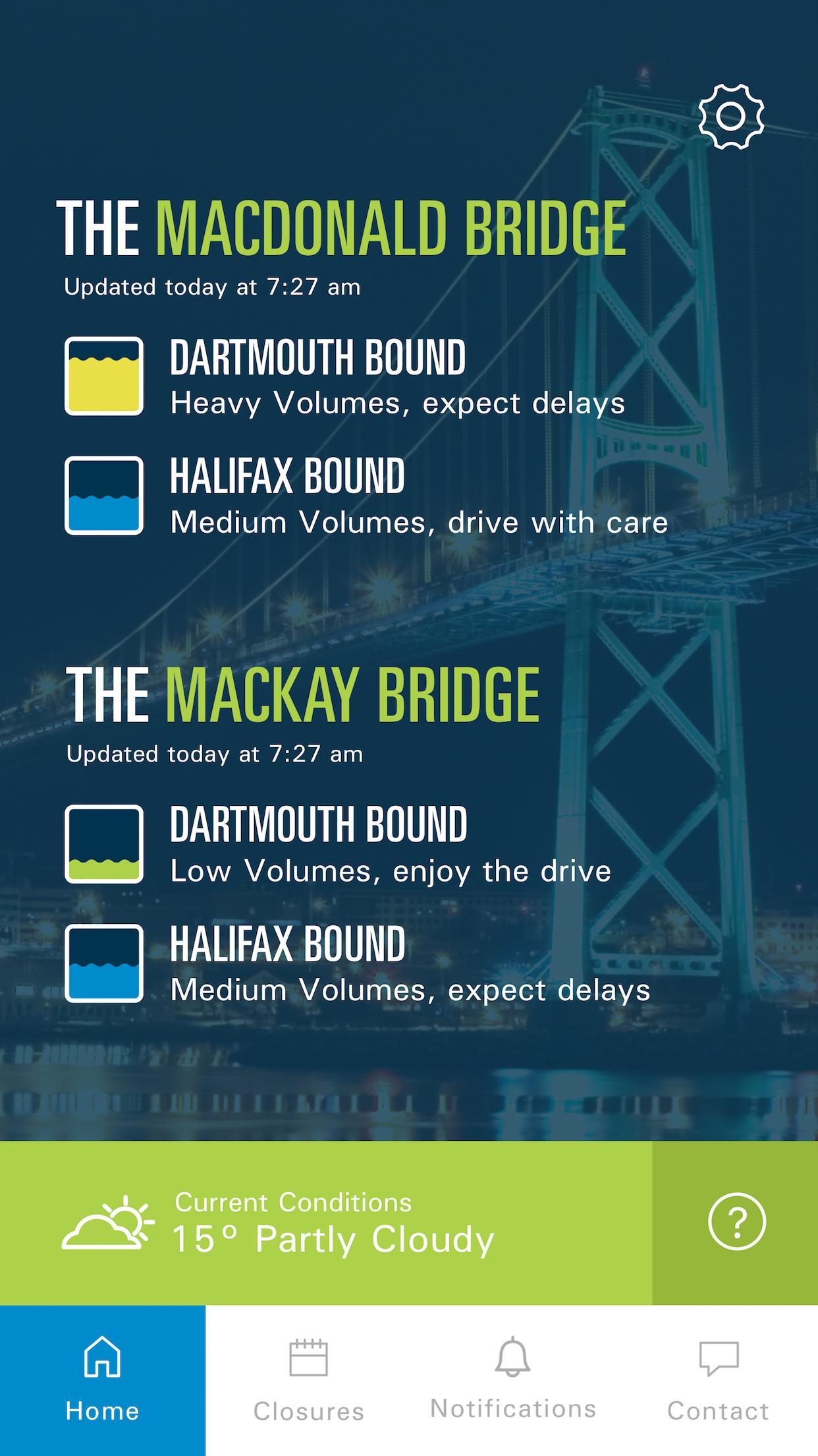L'application HHB Bridges fournit des informations de flux de trafic pour les ponts MacDonald et Mackay et peut être personnalisée: entrez l'heure de la journée dans laquelle vous utilisez les ponts et recevez une notification si un incident a lieu sur les ponts au moment où ils utilisent le pont afin que vous puissiez prendre un autre itinéraire. Une nouvelle section affiche des webcams à l'approche des étendues des ponts comme un autre outil pour en savoir plus sur le trafic sur les ponts.