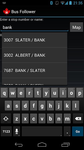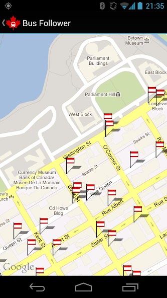 Veuillez noter qu'OC Transpo ne fournit pas encore d'informations GPS pour tous les bus, et que vous ne verrez les informations GPS que pour les bus qui ont commencé leur voyage vers votre arrêt. Ce sont des limites des systèmes d'OC Transpo, et il y a peu que mon application ne puisse faire à ce sujet. Lorsque les données GPS ne sont pas disponibles, les heures d'arrivée prévues apparaîtront au lieu des heures estimées.