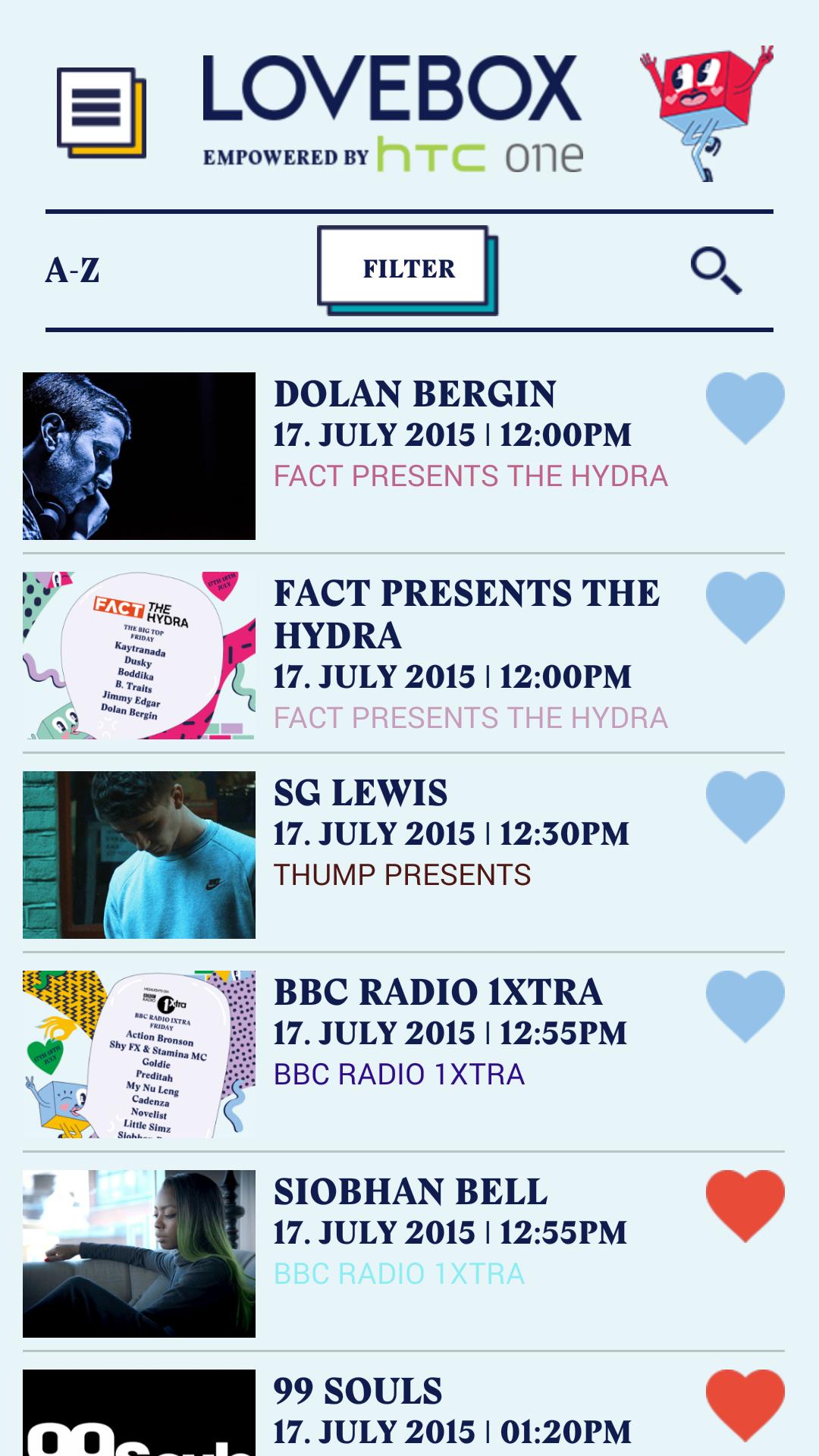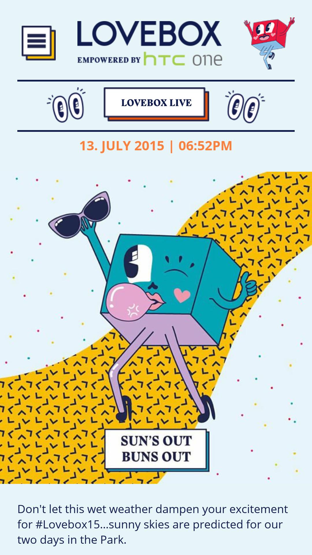 Nos temps définis vous assureront de ne pas manquer vos actes préférés, tandis qu'une boîte de réception dans l'application recevra des messages et des nouvelles importants de l'équipe Lovebox vous tienant informé de ce qui est ce qui est le jour. Ailleurs, découvrez de nouveaux actes et lisez plus sur vos artistes préférés dans notre programme complet, achetez des marchandises officielles # Lovebox 15 dans notre magasin et jouez avec le photobooth officiel Lovebox X HTC.