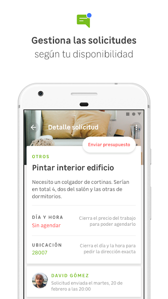 Grâce à Hogami vous recevrez des demandes de travail de peinture, de revêtements de sol, de bricoleur, d'installations, de plomberie, d'électricité, de décoration, de services de déménagement, de nettoyage, de jardinage et de tout service lié à l'entretien et à la rénovation des espaces.
