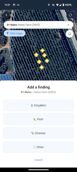 - Déposez une épingle à chaque arbre stressé, avec des données référencées par GPS sur une carte de votre ferme