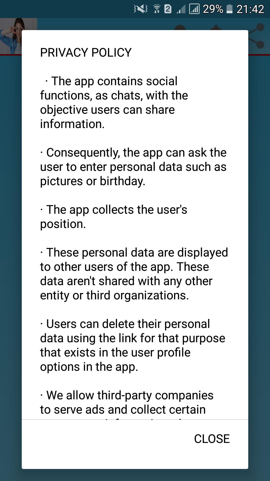 Eh bien, lorsque vous ouvrez l'application pour la première fois, vous pouvez soit vous connecter avec votre compte de conversation vidéo en direct des filles, soit remplir un formulaire de profil pour informer les autres de vous un peu plus sur vous. Les éléments du profil sont: nom, surnom, description facultative de vous-même, anniversaire, sexe et photo. Vous pouvez également spécifier si la réception de commentaires ou de messages privés est autorisé ou non.
