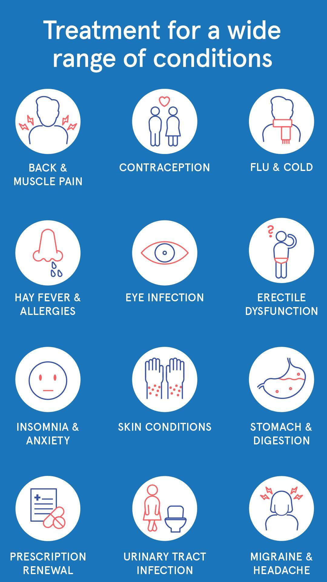 Nous ne remplacons pas les visites en face à face chez le médecin, mais si vous ressentez l'un des symptômes ci-dessous, économisez le temps et prenez une consultation en ligne.
