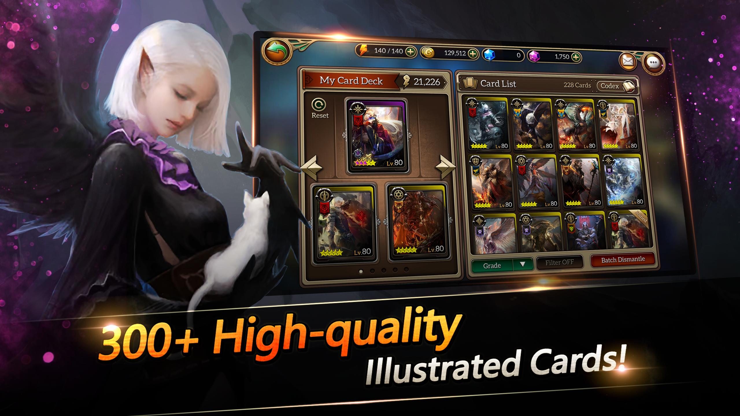 Assemblez votre propre deck en utilisant des centaines de cartes uniques et fantastiques avec divers types de races, de cours et de compétences dans votre propre stratégie.