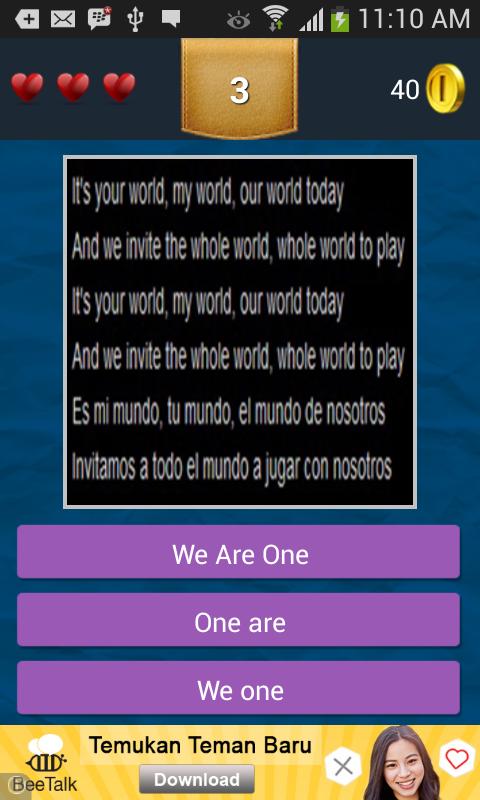 Tebak Lagu Terbaru est le jeu deviner les Tebak Lagu Terbaru chansons. Dans ce jeu, vous offrirez une image d'un morceau de paroles de chansons, puis vous avez 3 options pour répondre.