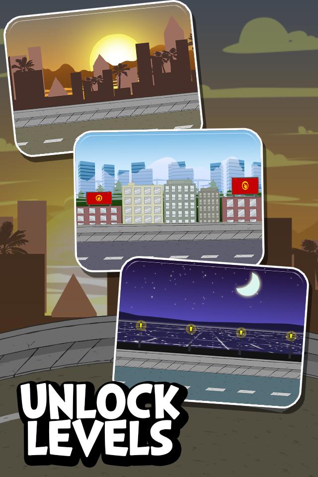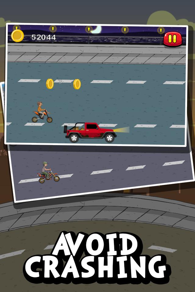 Appuyez sur l'écran pour faire en sorte que le vélo et le cavalier montent l'écran vers le bord éloigné de la rue. Arrêtez d'appuyer sur l'écran et il se dirigera vers le bord inférieur de la rue. Collectez des pièces pour débloquer de nouveaux niveaux difficiles et de nouveaux motards, ce qui ajoute à l'excitation.