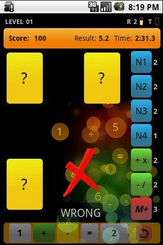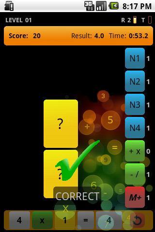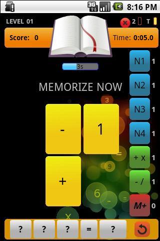 Le jeu vous montrera une table de cartes (jaunes), chacune contenant un numéro ou une opération mathématique, que vous devez mémoriser rapidement. Une fois que vous avez mémorisé, les cartes seraient bouleversées. Vous devrez alors générer une simple équation mathématique (en utilisant des boutons d'action bleu et vert). Mais un élément (un nombre ou une opération mathématique) serait manquante dans cette équation. Votre tâche serait de résoudre l'équation et de sélectionner la carte appropriée dans la pile de cartes qui complète l'équation.