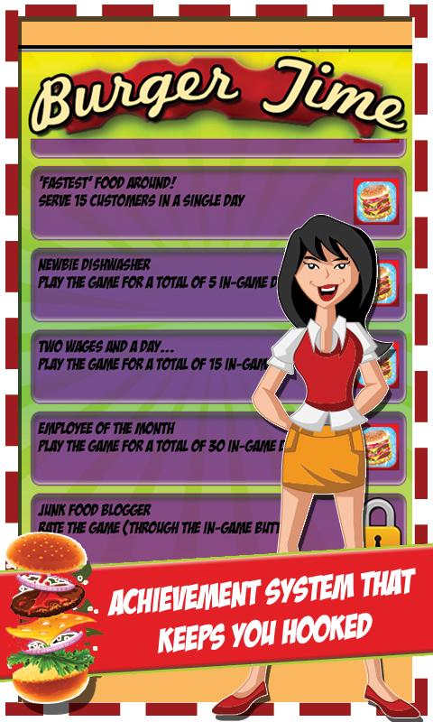 Burger Time tracks stats of everything you do. The number of customers you've served, the amount of cash you've earned, the number of days you've spent in the game – everything. The better you play, the more achievements you'll unlock, and the more you can boast about it to your friends.