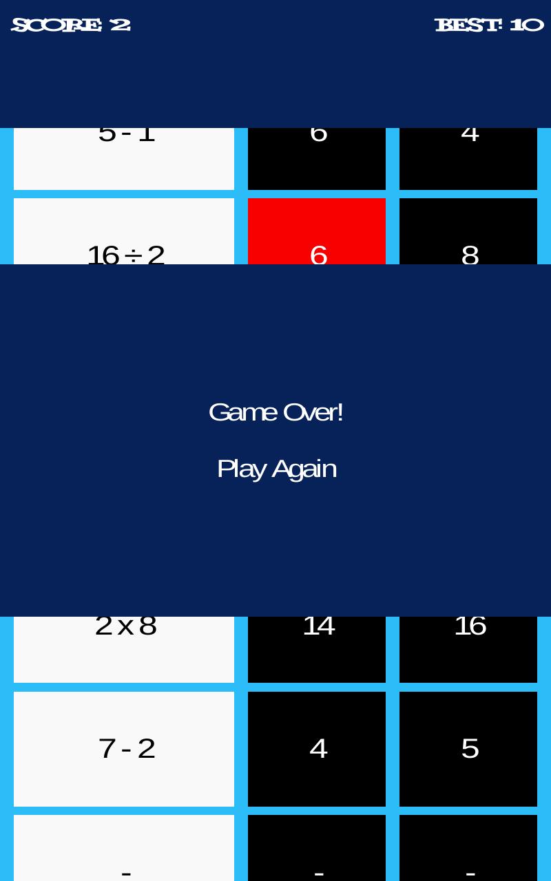 Les tests Accelerated Math sont un jeu GRATUIT de formation en mathématiques et de test de test composé d'exercices de formation en mathématiques de base pour les adultes et les enfants avec une belle conception de jeu. Êtes-vous prêt à relever le défi et à tester votre cerveau avec de simples problèmes mathématiques? Améliorez vos compétences en mathématiques de base en jouant quotidiennement à cet excellent entraînement de test de mathématiques. Toutes les questions d'ajout, de soustraction, de multiplication et de division sont créées au moment de l'exécution et vous ne pouvez pas prédire la réponse sans résoudre un problème. Les carreaux blancs contiennent des questions mathématiques de base générées de manière aléatoire et les carreaux noirs contiennent les réponses. Dans chaque question, l'objet est de répondre le plus rapidement possible pour gagner plus de points dans un temps donné, mais méfiez-vous de ne pas appuyer sur les mauvaises carreaux car cela mettra fin à votre tour. Les exercices deviennent encore plus difficiles une fois que le temps est écoulé et que l'accélération augmente lorsque vous résolvez les questions. Le vrai défi consiste à éviter de mauvaises réponses et à répondre rapidement pour économiser à l'heure. Vous pouvez devenir un vrai solveur de mathématiques en jouant régulièrement à ce jeu.