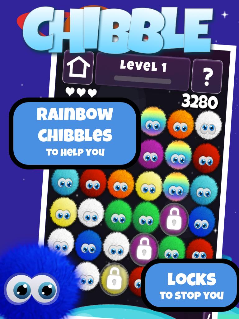 Gagnez des points supplémentaires pour faire correspondre plus de 3 Chibble S et pour faire correspondre les Chibble arc-en-ciel insaisissables.