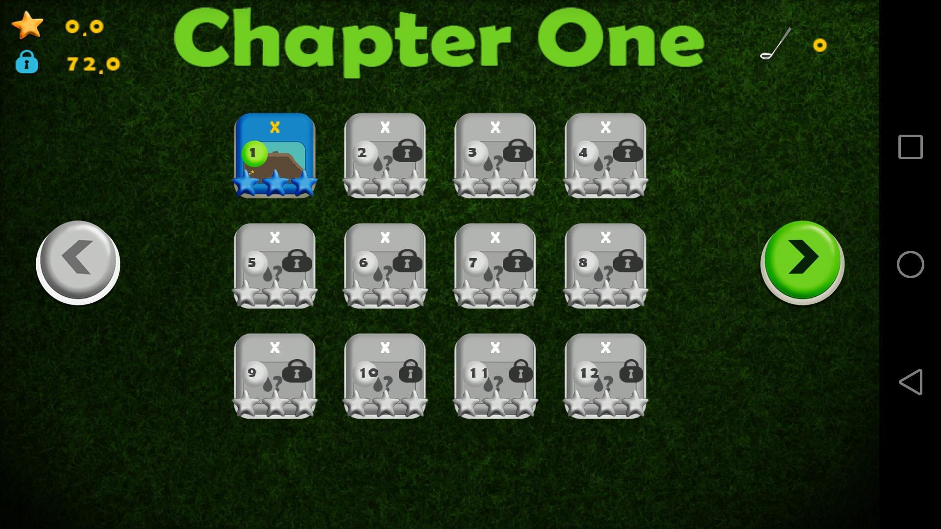 - Deux chapitres - plus de 48 niveaux en tout - Sélectionner le club de golf (fer, bois, putter)