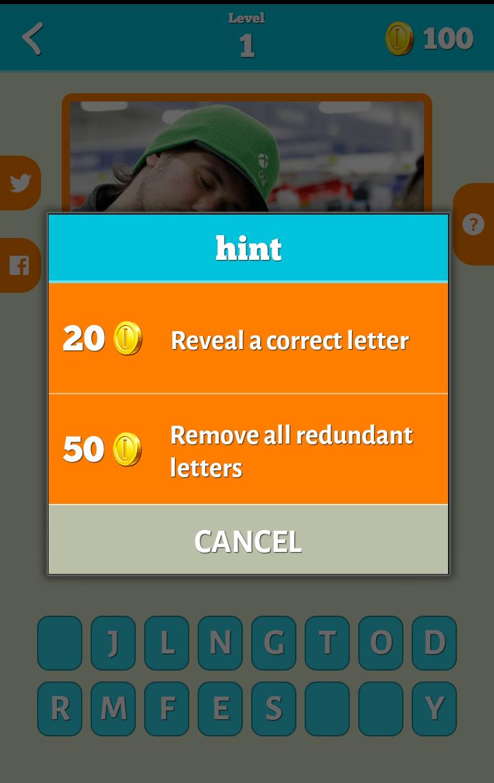 - If you’re stuck, we’ve got some hints for you to find the right name. You can use your coins to reveal a letter or you can remove all redundant letters. If the hints are not enough for you, you can simply ask your friends by using social media buttons.