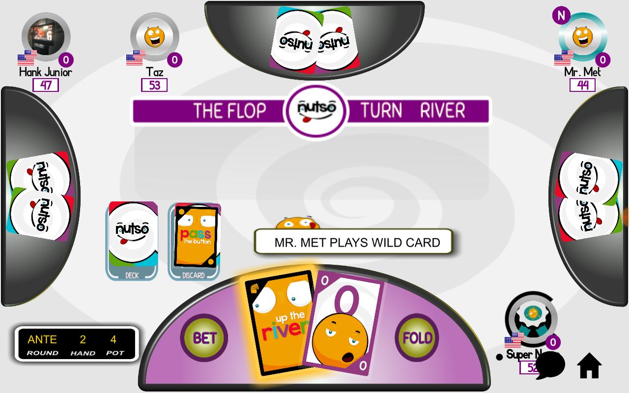 Play "NUTSO" a fun poker style card game. Make the best 5 card hand using 2 hole cards and 5 community cards. Also wild cards can turn the mightiest of hands into a loser. Last one with chips wins the game.