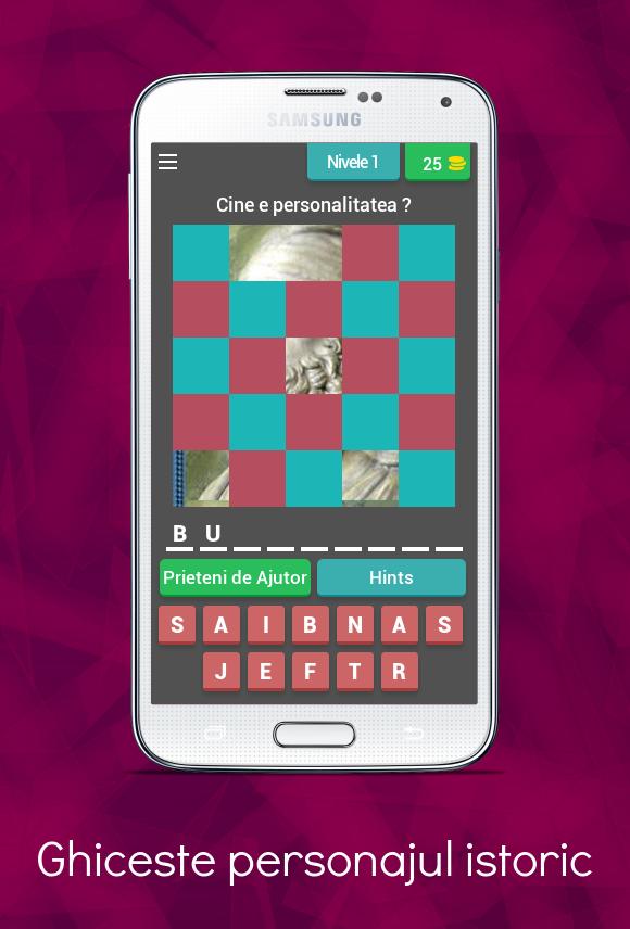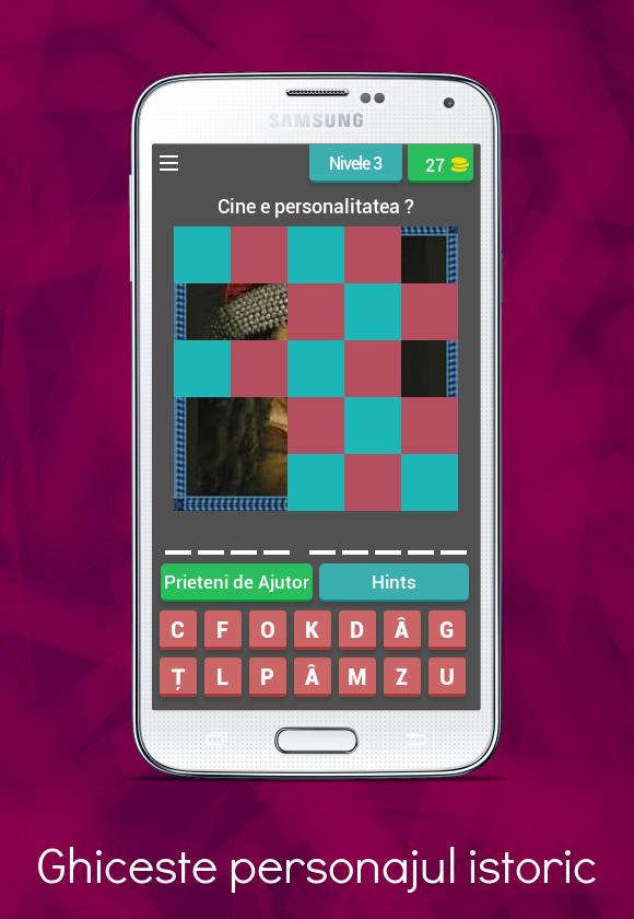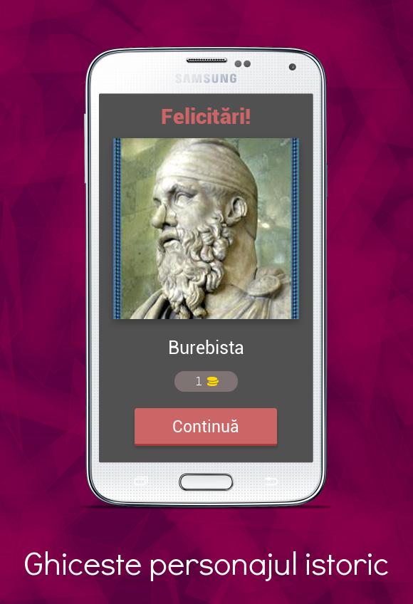 " Ghiceste Personajul Istoric " is a Trivia type game, in which you have to guess the names of very important personalities in the history of our country: rulers, kings, ministers and leaders of riots who acted to make a more prosperous, and happier Romania.