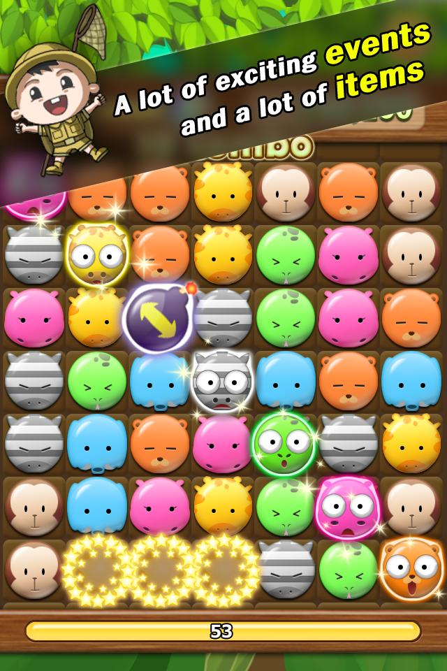 Coming to Jungle Pang, players will get lost in a forest with many different animals and players need to quickly find the same animals and arrange in the same vertical or horizontal rows according to the principle that there are at least 3 similar animals to make them disappear.