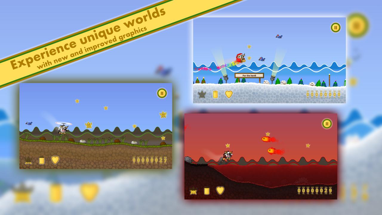 In this brand new side-scrolling arcade game the cow is trying to succeed once more. Only this time enemies are fighting back!