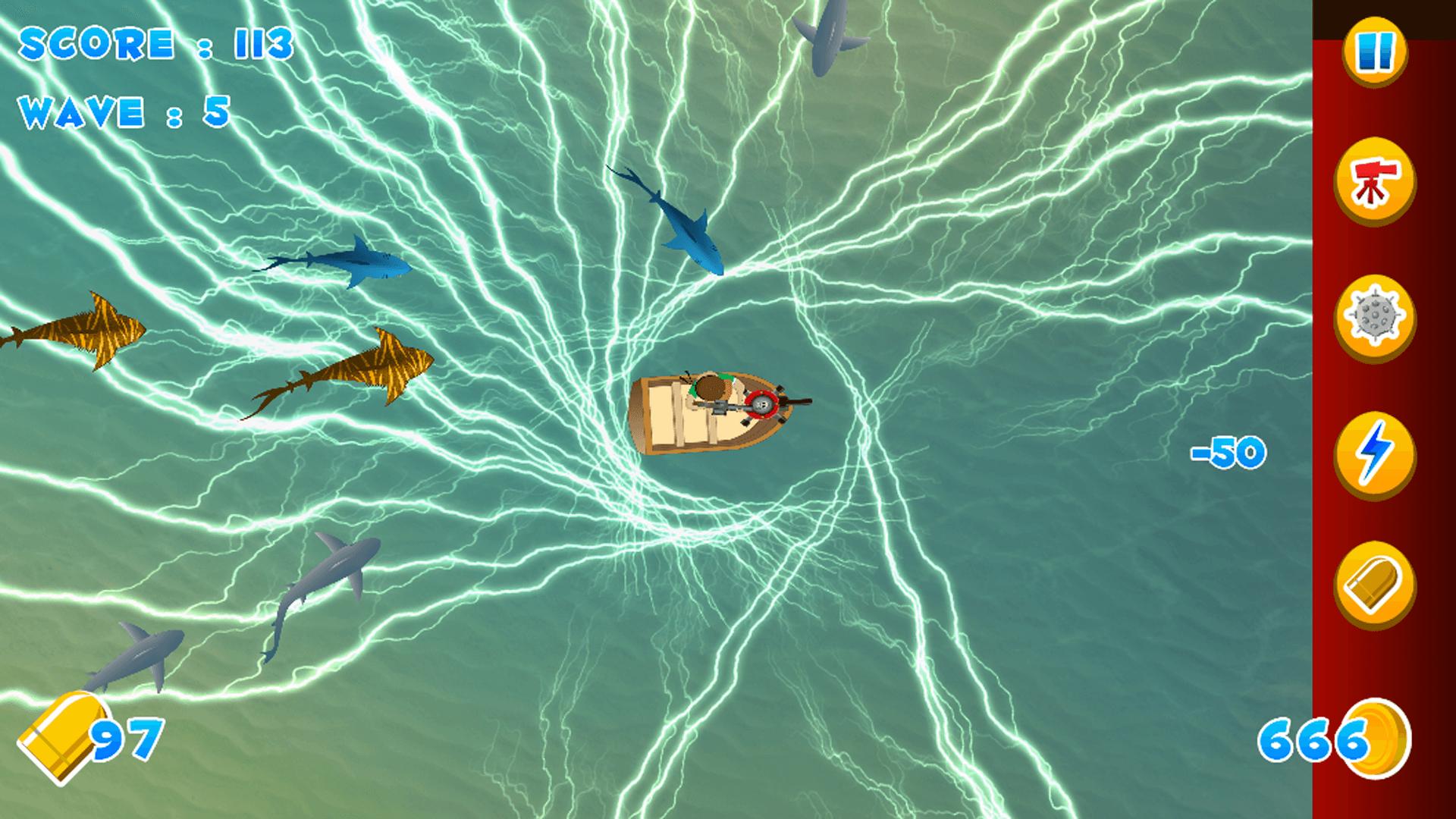 To protect the fisherman from Shark attacks you have to tap them (they die) and counts as a point. In one wave many Sharks will attack. Do not let them hit the boat three times in a row.